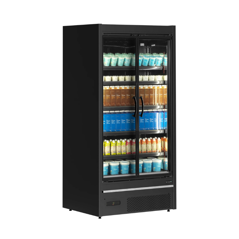 The black supermarket refrigerated display case with 2 glass doors from the brand TEFCOLD is a refrigerator and freezer with a capacity of 629 L. This kitchen equipment is ideal for catering professionals. Featuring an elegant design and an energy-saving refrigeration system, this refrigerated display case combines aesthetics and functionality.