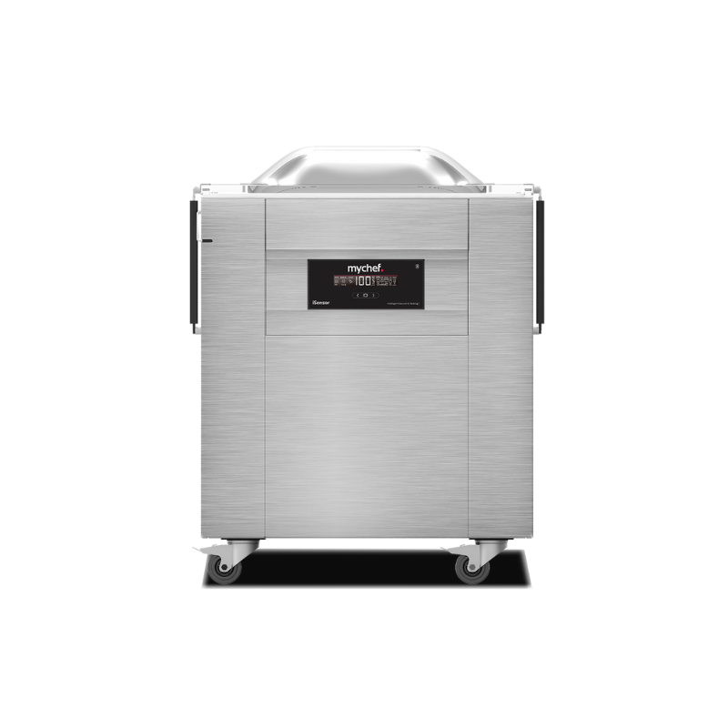 Il est possible d'emballer de gros volumes, grâce au grand renfoncement au fond et au couvercle transparent en dôme. Avec des pinces dans la chambre pour maintenir les sacs en place pendant la mise sous vide. Capacité de la pompe : 333,3 L/min. Dimensions chambre : 425 x 457 x (H) 100 mm.